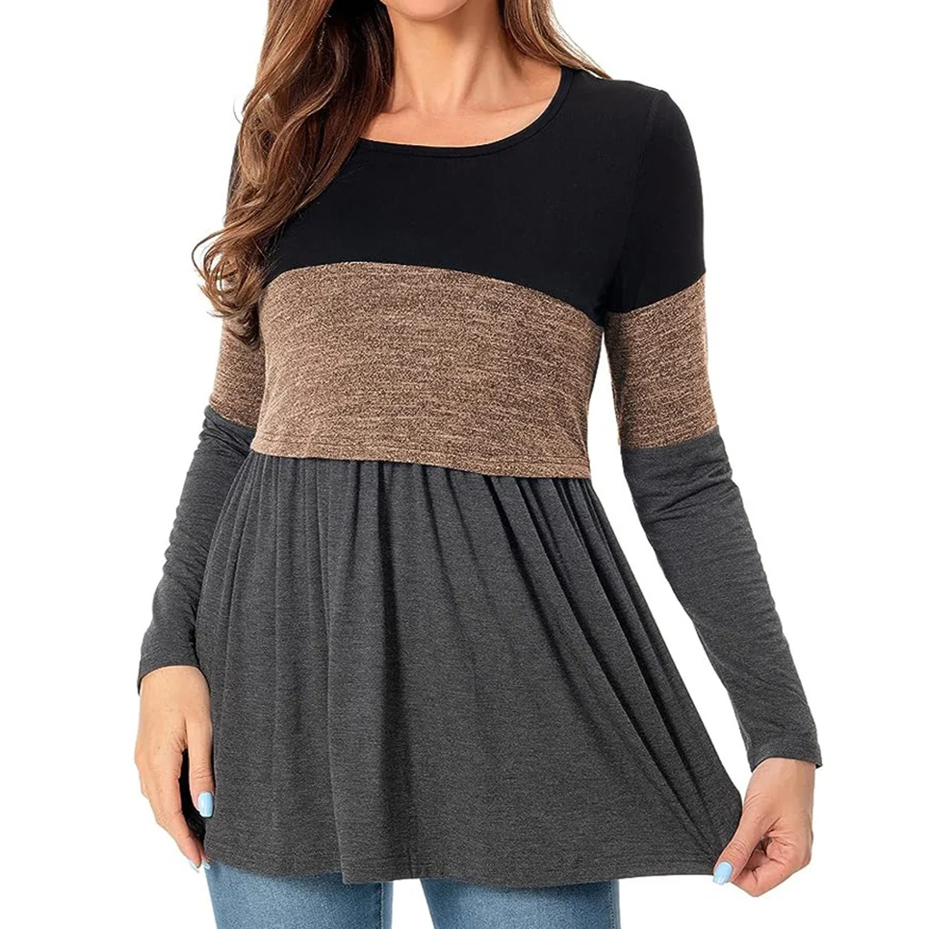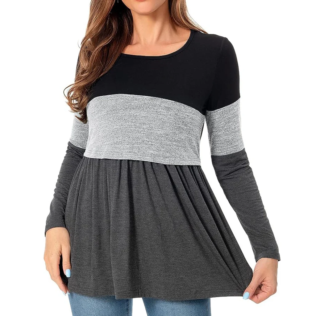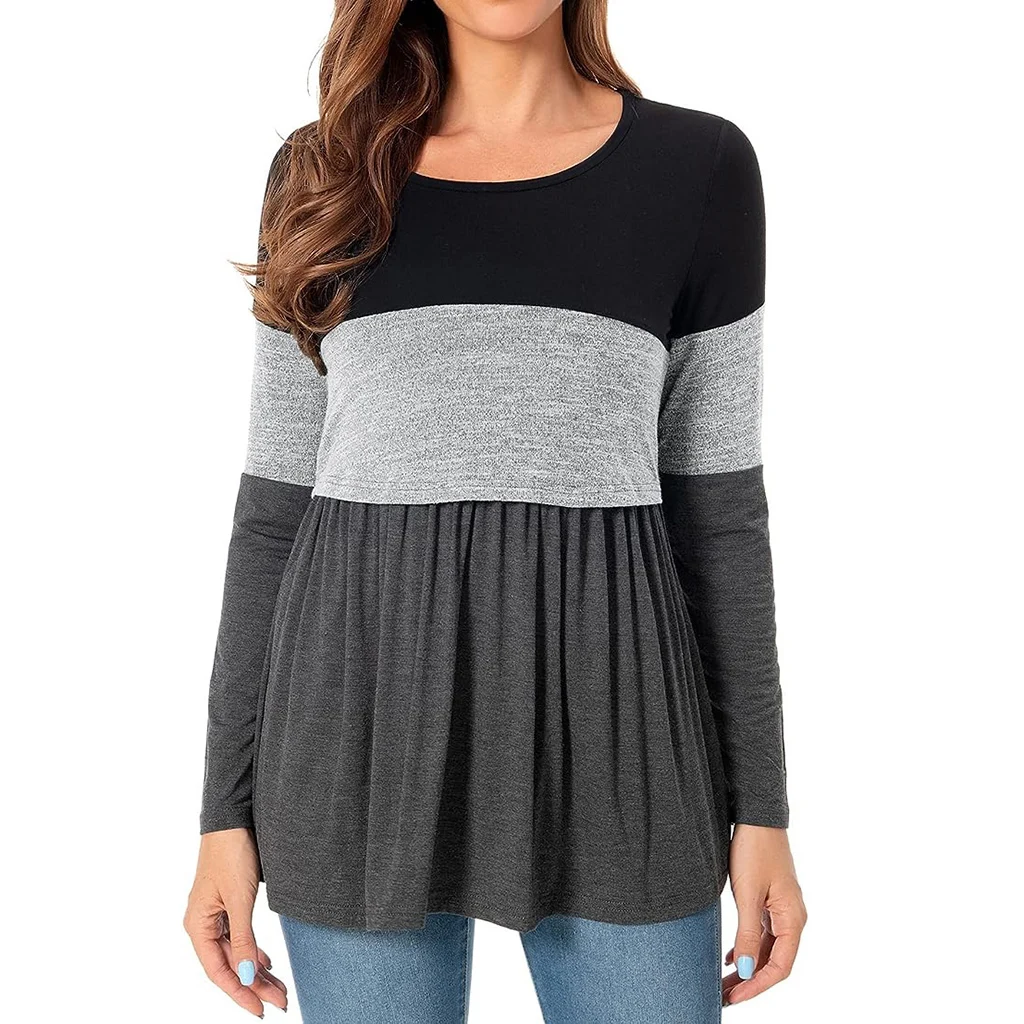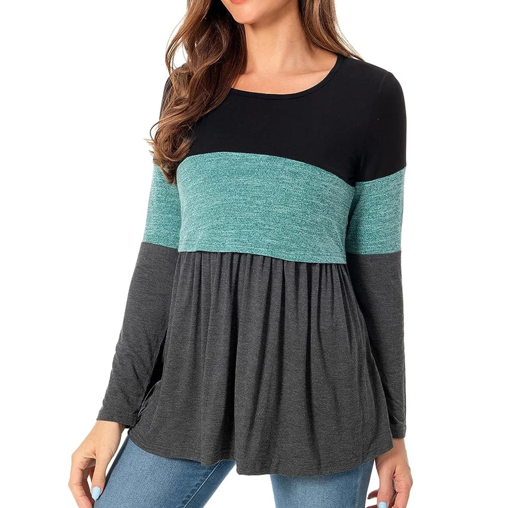 Camiseta feminina maternidade manga comprida gola redonda bloco de cores amamentada para amamentação roupas de gravidez